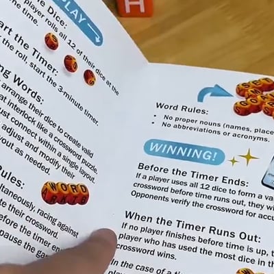 This dice crossword game comes in a small fabric sack and is perfect for travel. It is a simple game, but can provide hours of fun. The letters are printed large and clear on the dice and they are a good size. Overall, good quality for the price.